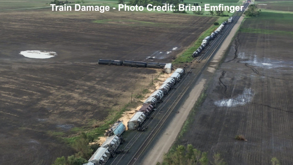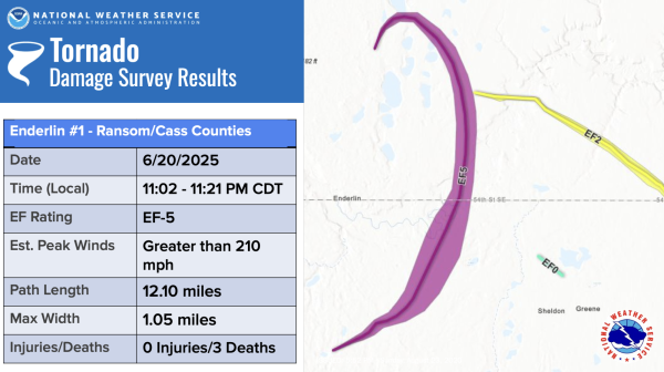 “The National Weather Service in Grand Forks conducted additional surveys and worked extensively with wind damage experts to further investigate the 20 June 2025 Enderlin, ND tornado #1. The estimated maximum wind speed of the Enderlin, ND tornado #1 is greater than 210 mph and occurred during the time of the train derailment south of Enderlin, ND. The analysis involved forensic damage wind speed estimates for tipping several fully-loaded grain hopper cars and lofting of tanker cars, including one empty tanker car that was tossed about 475.5 ft (145 m). The maximum wind speed also correlates to the maximum strength on the WSR-88D Storm-Relative Velocity data from KMVX.”